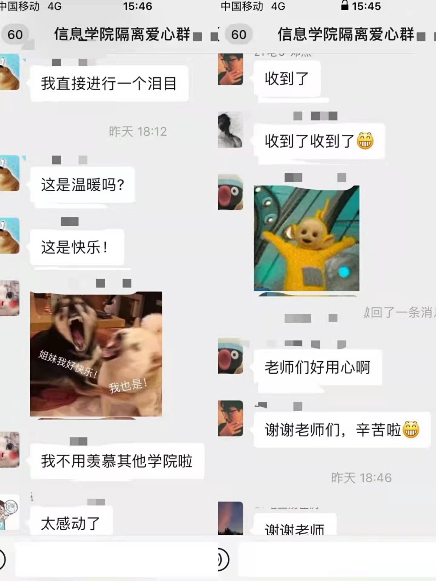 近日,我省疫情防控形势严峻复杂。根据上级防控工作要求,信息公司党委高度重视疫情防控工作,第一时间做出响应,积极动员全院师生紧急摸排疫情相关情况,并按要求妥善安置相关人员进行隔离观察。对于被隔离员工的情况,公司党委始终与员工在一起,共克时艰、携手战疫。辅导员第一时间成立了隔离爱心群,将公司党委副书记、辅导员、党员志愿者(一对一)拉入群,第一时间了解被隔离员工所需,全力保障员工隔离期间的日常学习生活。