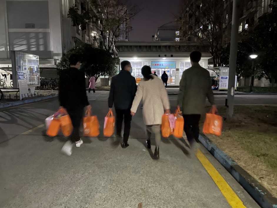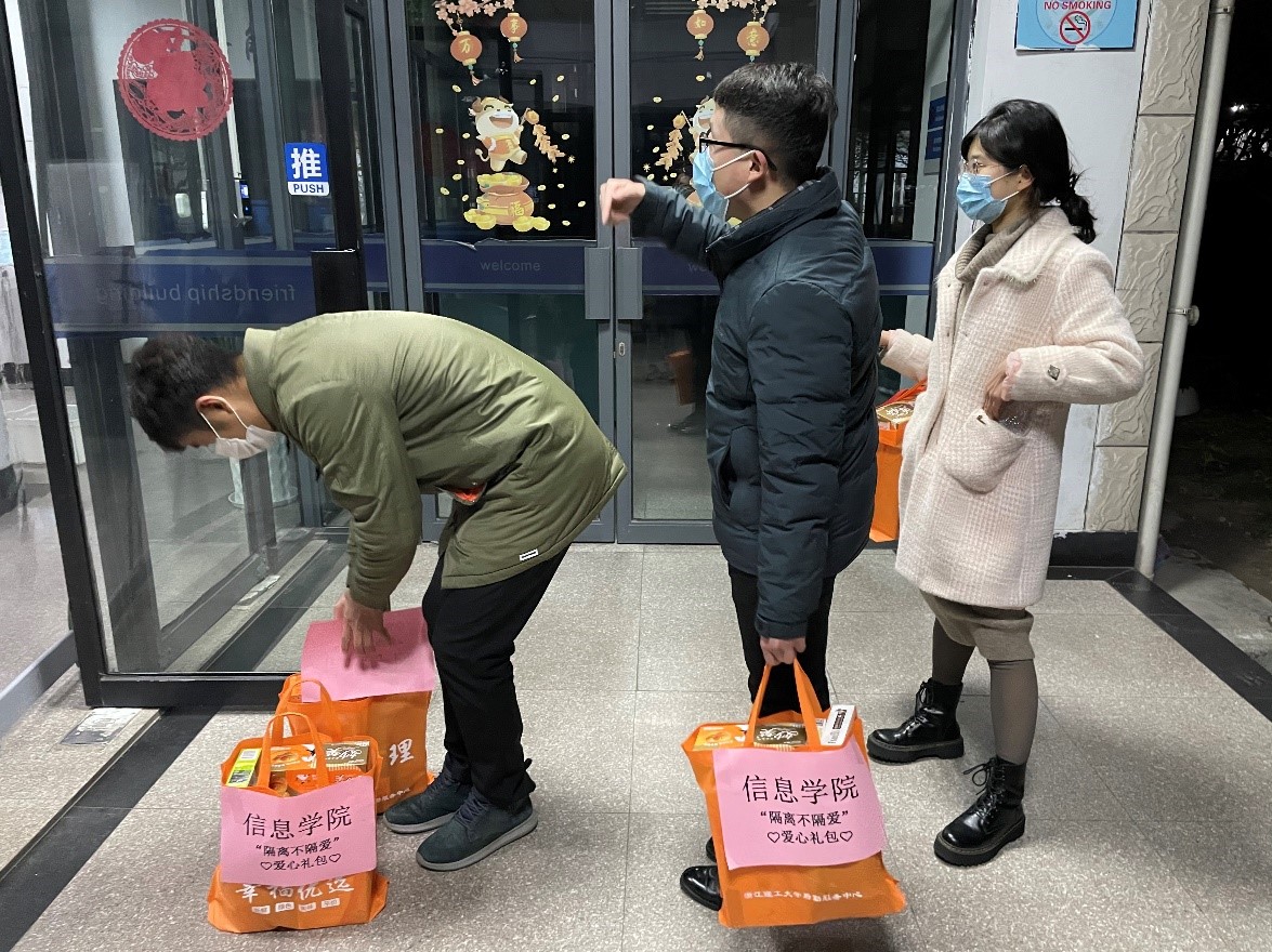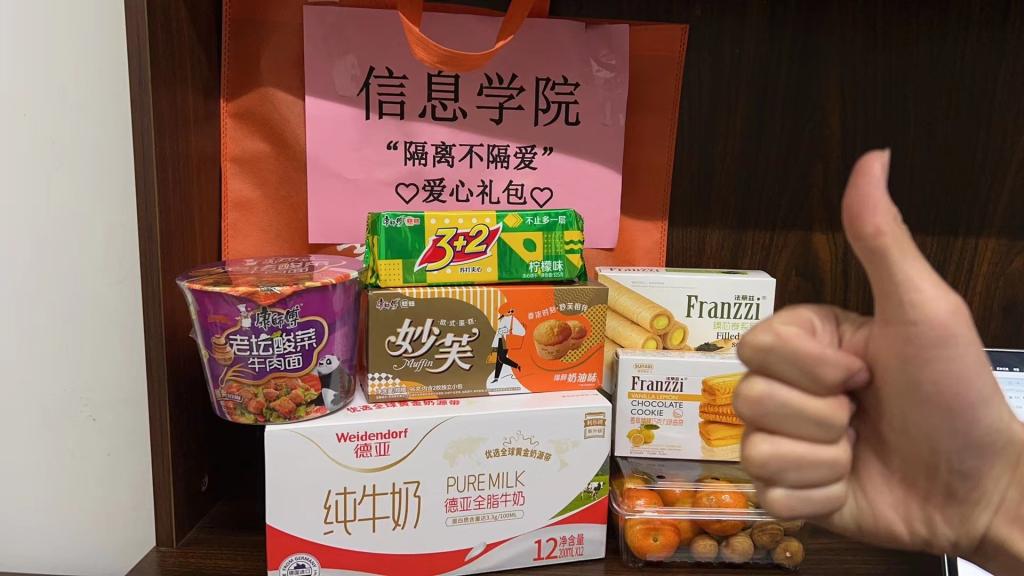 员工说:“晚上饿,想吃夜宵”。学院马上行动。12月8日晚,学院精心准备了零食,由教师党员、辅导员一行为隔离员工送去冬日温暖。员工们纷纷在爱心群晒出收到爱心礼包的合影照片,表达了激动的心情和对学院的感激之情